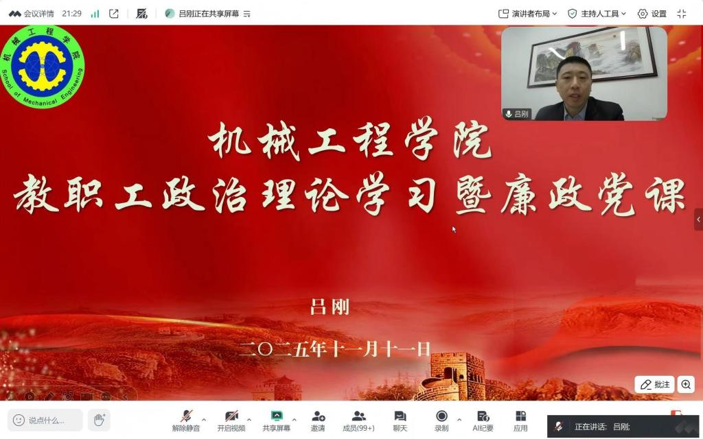 11月11日,机械工程学院以线上形式召开了教职工政治理论学习会议,深入学习宣传《习近平谈治国理政》第五卷和党的二十届四中全会精神。学院全体教职工参加了会议。学院党委书记吕刚主持会议并作宣讲辅导。