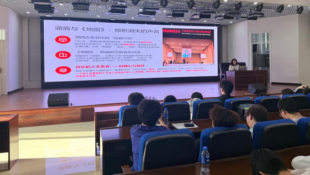 杨凤娟教授以周杰伦的《安静》等音乐为切入点,阐释音乐赋予人“接纳与共情”的能力;又以巴赫《赋格的艺术》回应“碎片化焦虑”,将大学生活比作赋格曲,强调在课程、社团等多任务中寻找“主旋律”与“伴奏”的平衡,让内心拥有属于自己的秩序。在谈及家国情怀与逆境时,她分享了谭盾的《地图》以及《歌唱祖国》引导学生激发民族认同;她借阿炳的《二泉映月》点明音乐是“时间的艺术”,鼓励同学们珍惜当下、接纳挫折作为人生乐章的“休止符”,坚信“内心有光,便不会被打倒”。最后,她总结音乐赋予人文素养的七种形式:共情、友谊、爱与勇气、坚定毅力、理性秩序、悲悯与家国情怀、活在当下的清醒,寄语学子“让听过的每首歌成为生命的底色,让爱过的每个人成为成长的阶梯,让走过的每一段路成为未来的序曲。”