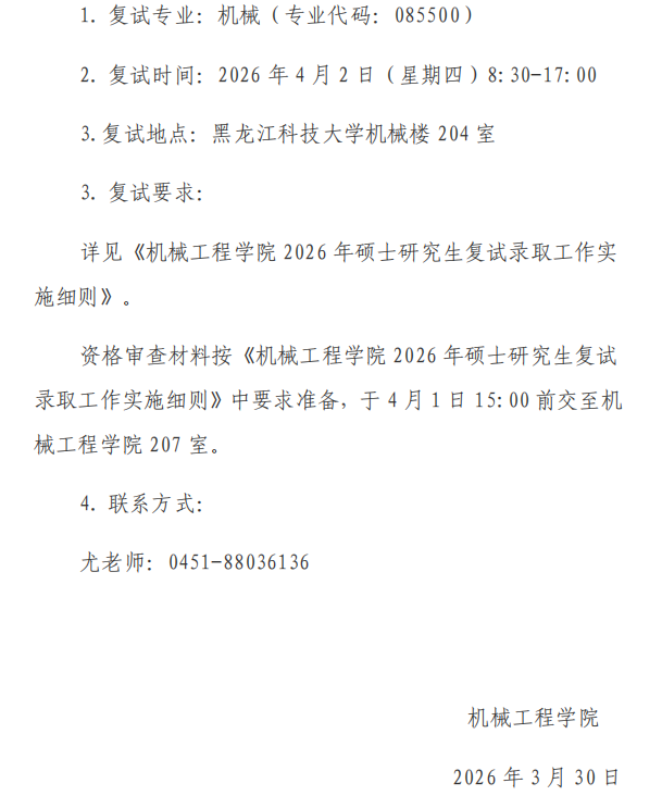 黑龙江科技大学机械工程学院2026年硕士研究生一志愿复试录取工作实施细则