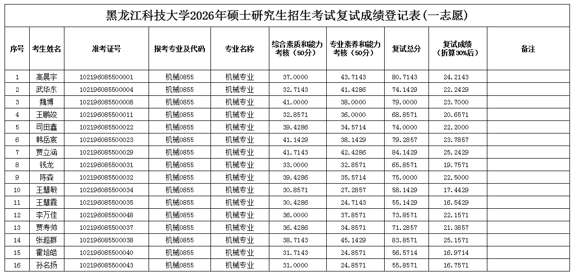 2026年全国硕士研究生招生考试黑龙江科技大学机械工程学院一志愿复试成绩公示