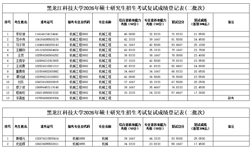 黑龙江科技大学2026年硕士研究生招生考试复试成绩登记表(二批次)